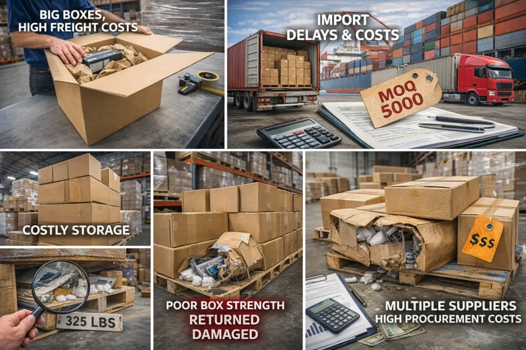 Because of freight, customs, delays, and minimum order quantities, importing packaging to reduce unit costs frequently results in higher overall expenses.